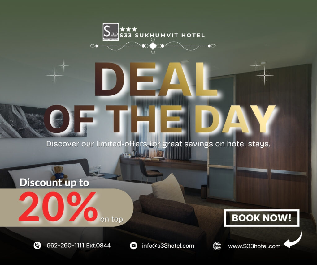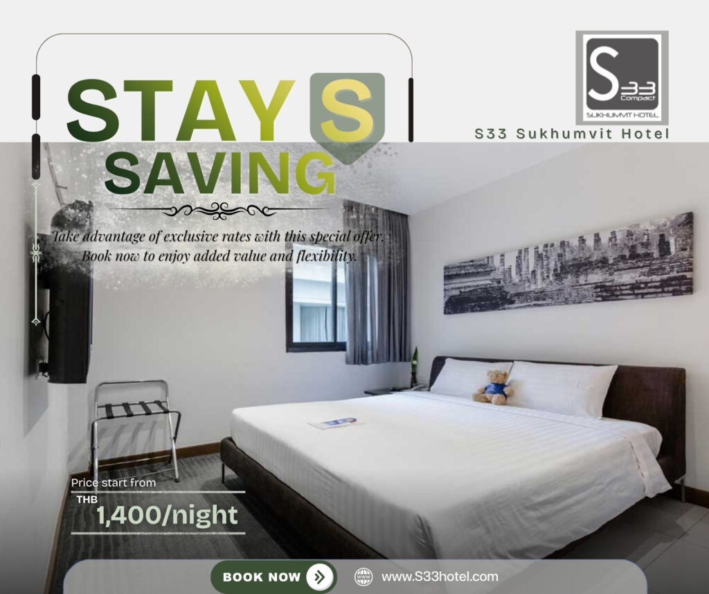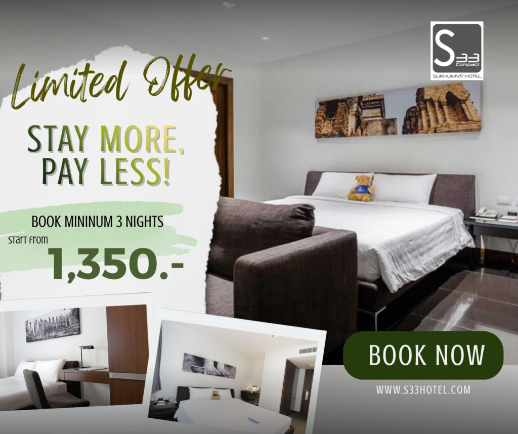 The hotel is also surrounded by corporate buildings, shopping centres, and the entertainment district. A sanctuary of urban living, quality services, and a reasonable and affordable price with a great location and easy access to the city’s main attractions, S33 Compact Sukhumvit Hotel perfectly suits the needs of both business and leisure travellers, especially those looking for a hotel in Bangkok near a BTS station.