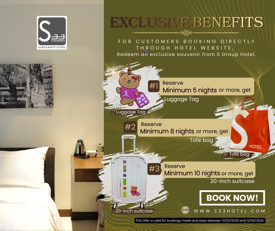 Enjoy a comfortable stay with high-standards under The S Group Hotel Chain, Thailand. S33 Compact Sukhumvit Hotel provides prompt service and pays attention to all our customers’ requirements and immediate needs. We offer equally superior service to all customers as we consider them as our family members. Our reception is available 24 hours and our security system is fully operational round the clock. Wi-Fi is also available in the entire building. In addition, we provide luggage storage, parking spaces, daily housekeeping, and even though our hotel in Bangkok is near BTS Phrom Phong. Helpful services such as a transportation service to and from the airport, as well as a laundry is also available.
